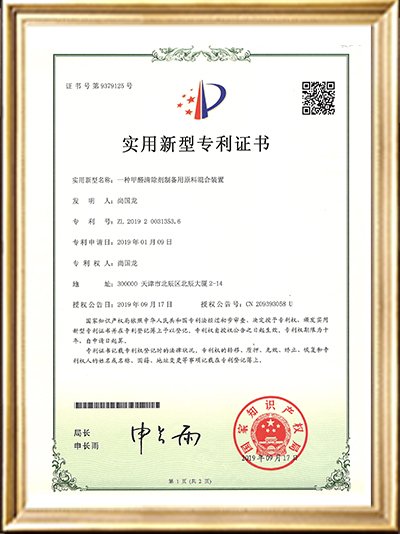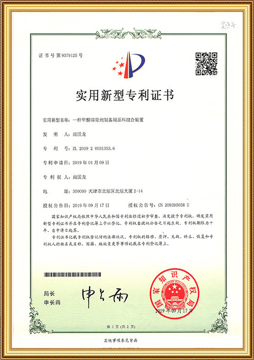 • 實用新型專利證書(一種甲醛清除劑的原料存儲